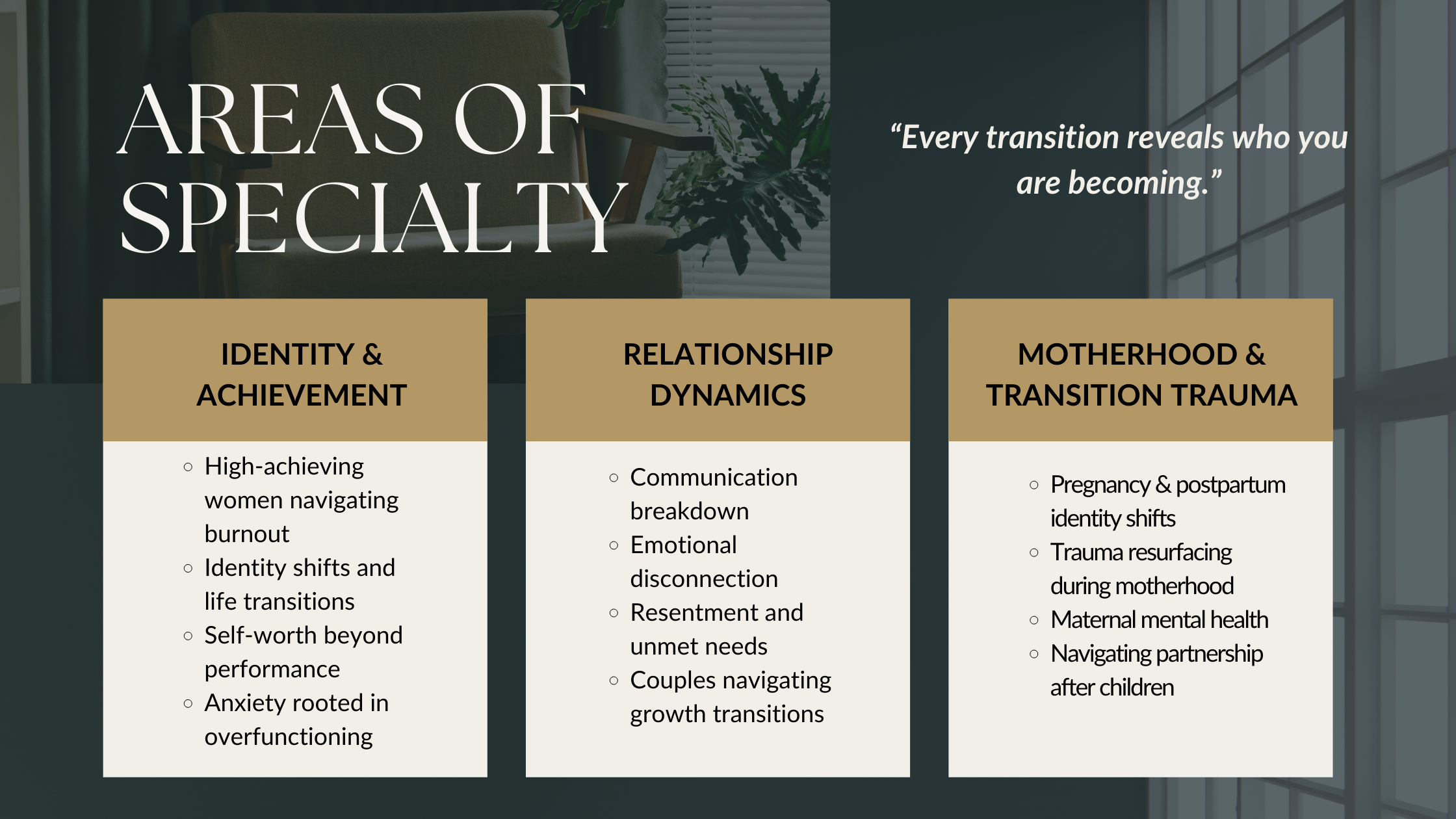 Whether you are navigating trauma, anxiety, postpartum challenges, relationship struggles, or identity exploration, we walk alongside you with compassion and evidence-based care.